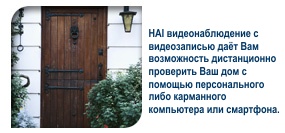 HAI предлагает Систему Видеонаблюдения и Записи, которая позволит Вам не только вести круглосуточную видеозапись активности, происходящей на территории Вашей собственности, но и иметь возможность проверить свой дом с удалённого компьютера, а так же подключенных к интернету мобильных устройств, таких как КПК и Сотовых телефонов. Вы сможете увидеть гостей подошедших к Вашей двери, либо посмотреть детей, играющих на заднем дворе, на экране настенных, настольных либо переносных сенсорных экранов, либо через интернет.